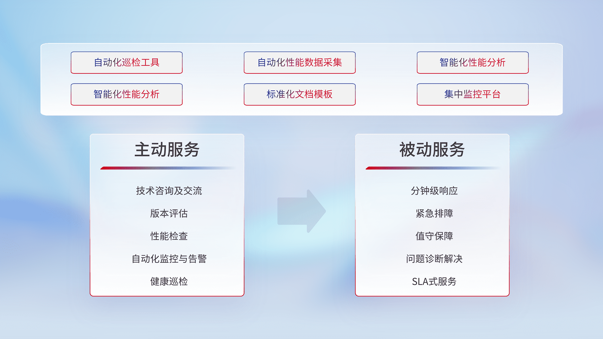 智能化工具和标准化文档,,,,保障服务质量,,,提供主动服务(包含技术咨询、、、、版本评估、、、、性能检查、、、自动化监控与告警、、、、健康巡检)和被动服务包含(分钟级响应、、、紧急排障、、、、值守保障、、、问题诊断解决、、、、SLA服务)。。