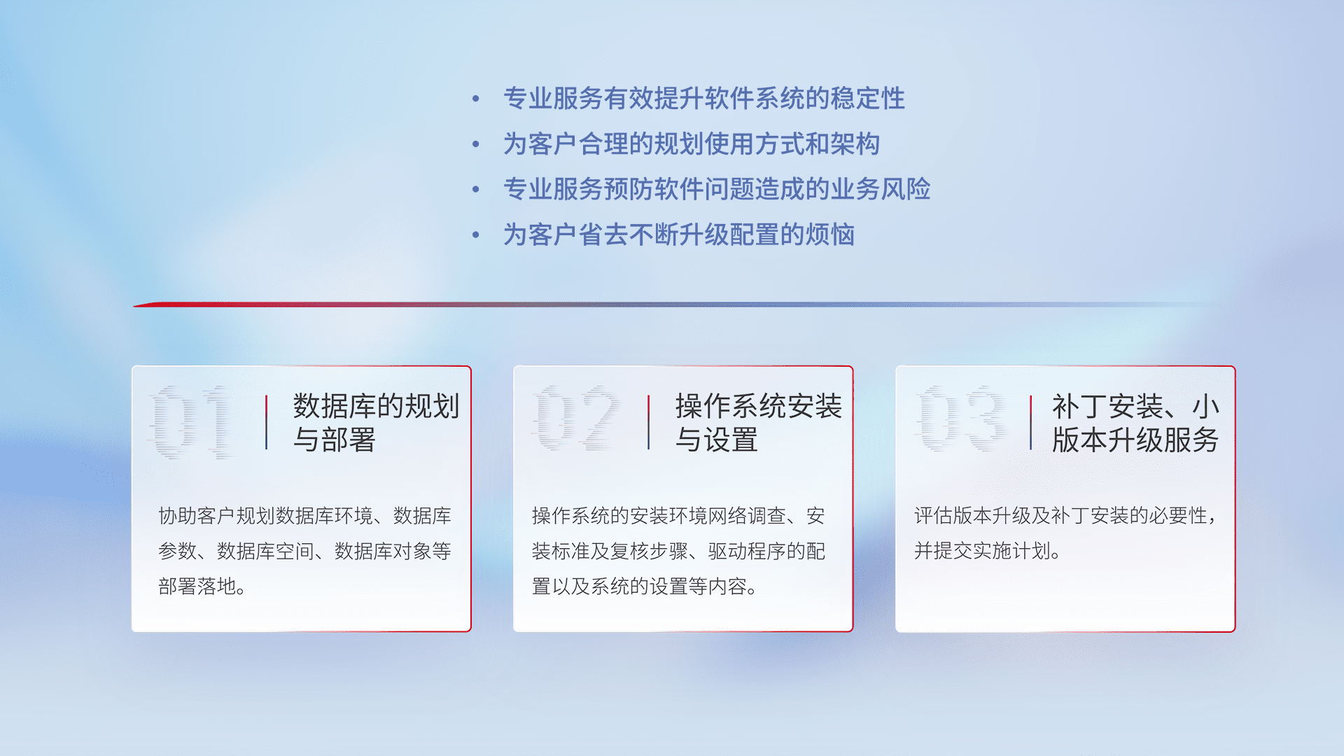 为客户提供软件规模升级、、、、快速部署、、、、按需配置的专业服务,,从数据库的规划与部署到操作系统的安装与设置,,,,再到补丁安装和小版本升级提供支持。。
