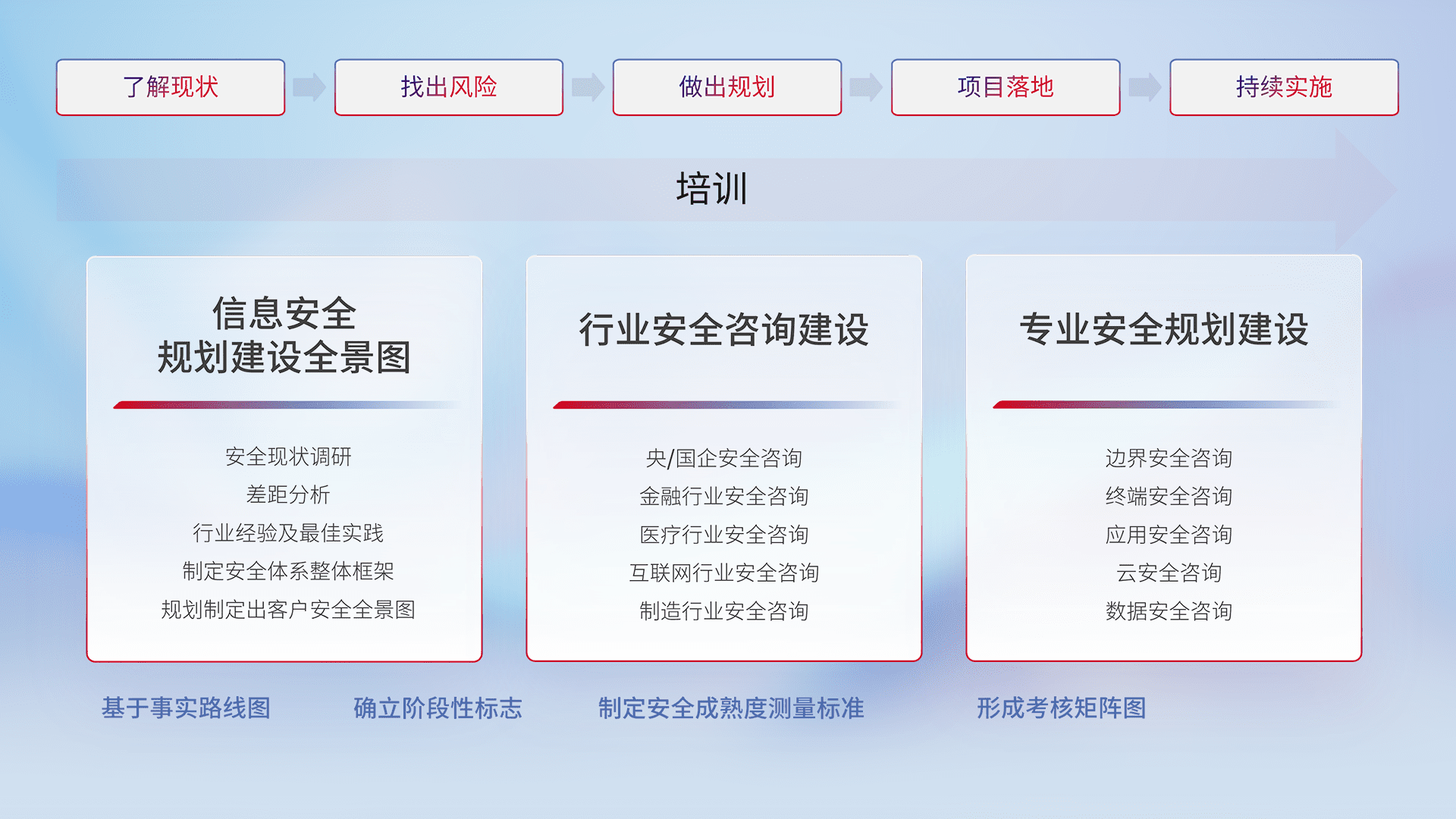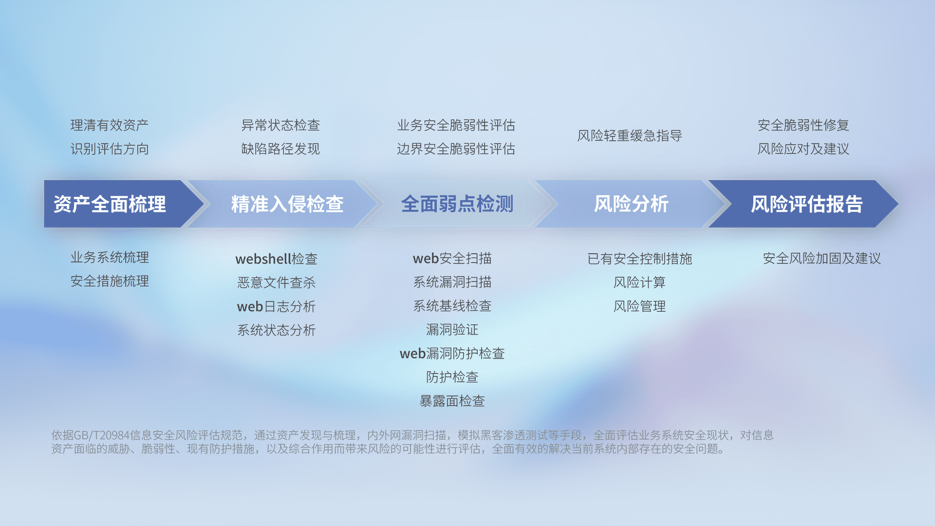 针对客户行业特性,,,,以专业的安全服务+多厂商联合解决方案提供专属的一站式安全管理服务,,,,帮助客户全面感知网络空间威胁,,,基于识别、、、检测、、、、分析、、、防护、、、、监测、、响应的服务理论模型,,从方案咨询、、、集成交付、、评估验证、、优化加固、、、运维运营,,,,致力于为客户提供完整的闭环管理式安全服务。。。。以实战经验为客户打造高抵御风险的安全体系,,,,帮助客户发现威胁、、、对抗威胁、、处置威胁,,,不断积累安全对抗能力,,持续保障数字化安全。。。